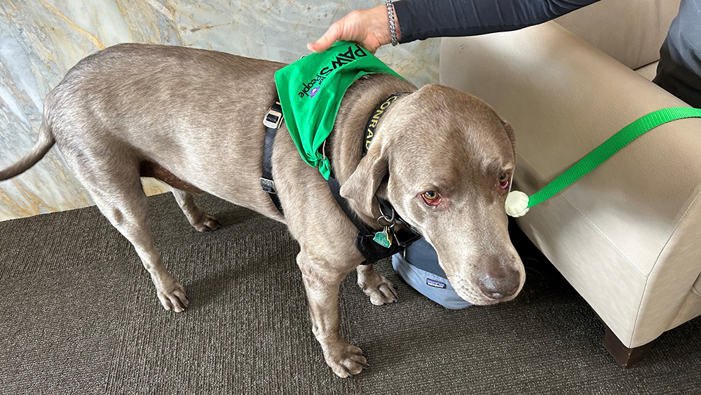 Two of the dogs at Neumann were Skye, who is a Shetland Sheepdog, and Conrad, who is a Weimaraner. The dogs are calm in stressful situations. They get lots of training and they are tested multiple times by Paws for People to work as therapy dogs.
