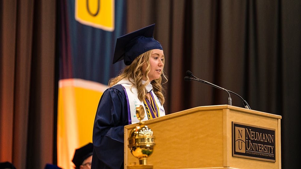 Beginning this year, Neumann is inviting graduating students to apply for student speaker roles. One student will be selected to speak at the undergraduate commencement, one at graduate commencement, and one at academic convocation.