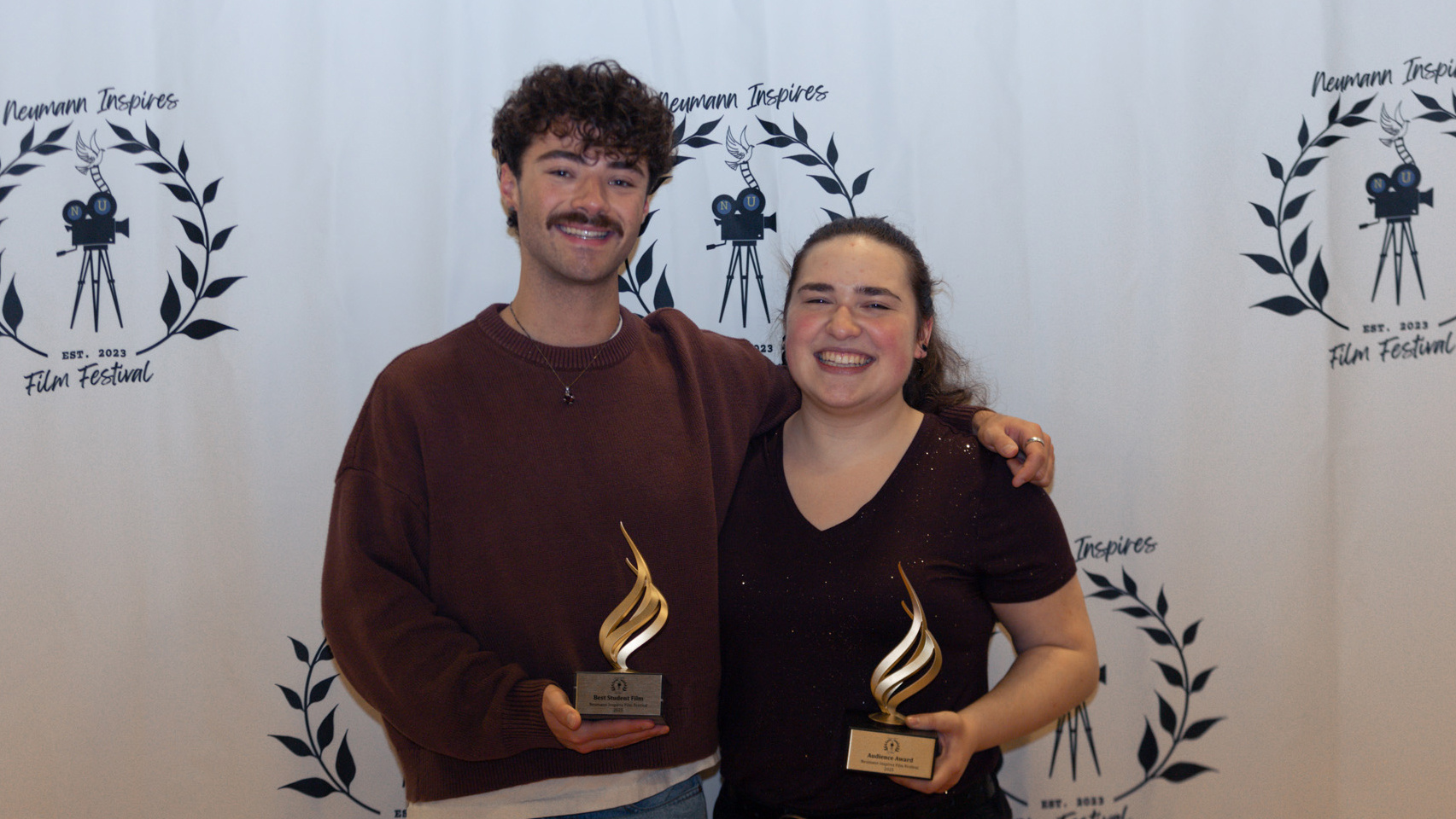 Student filmmakers Ethan Graci (Best Student Film) and Catherine Fochi (Audience Favorite) at the Neumann Inspires Film Festival.