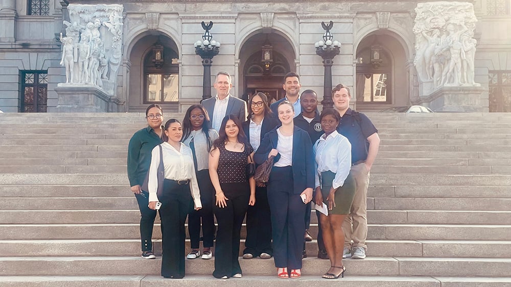 Political Science Professor Robert McMonagle and Campus Ministry Director Guilherme Lopes accompanied the group as part of an annual student advocacy day, sponsored by the Association of Independent Colleges and Universities of Pennsylvania (AICUP).