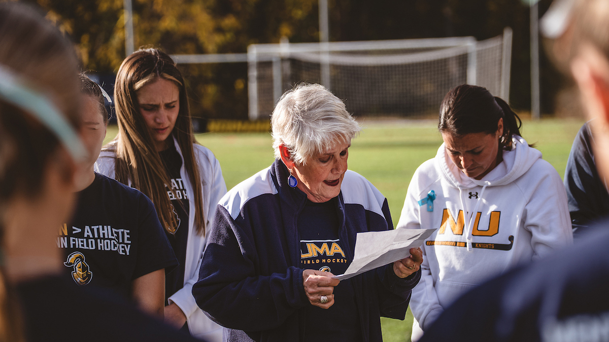 Natalie VanWyk offers a pre-game prayer with the field hockey team.